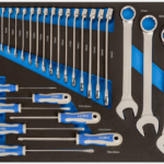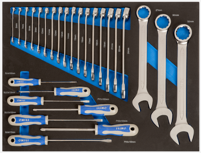 El foam IRIMO IFF1A003 contiene 27 piezas de destornilladores y llaves combinadas en bandeja 3/3, ideal para organización profesional en carros de herramientas modulares.
