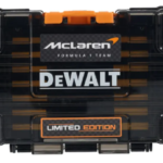 Diseño McLaren: estuche ToughCase apilable y conectable con tapa transparente, gráfica F1 y logos DeWALT x McLaren de alta visibilidad.